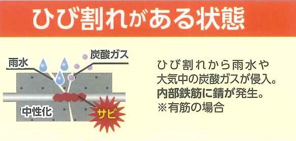 上記画像のようにヒビ割れしている箇所から雨水や大気中の炭酸ガスが侵入しコンクリート内部の鉄筋が錆びてしまいます。
