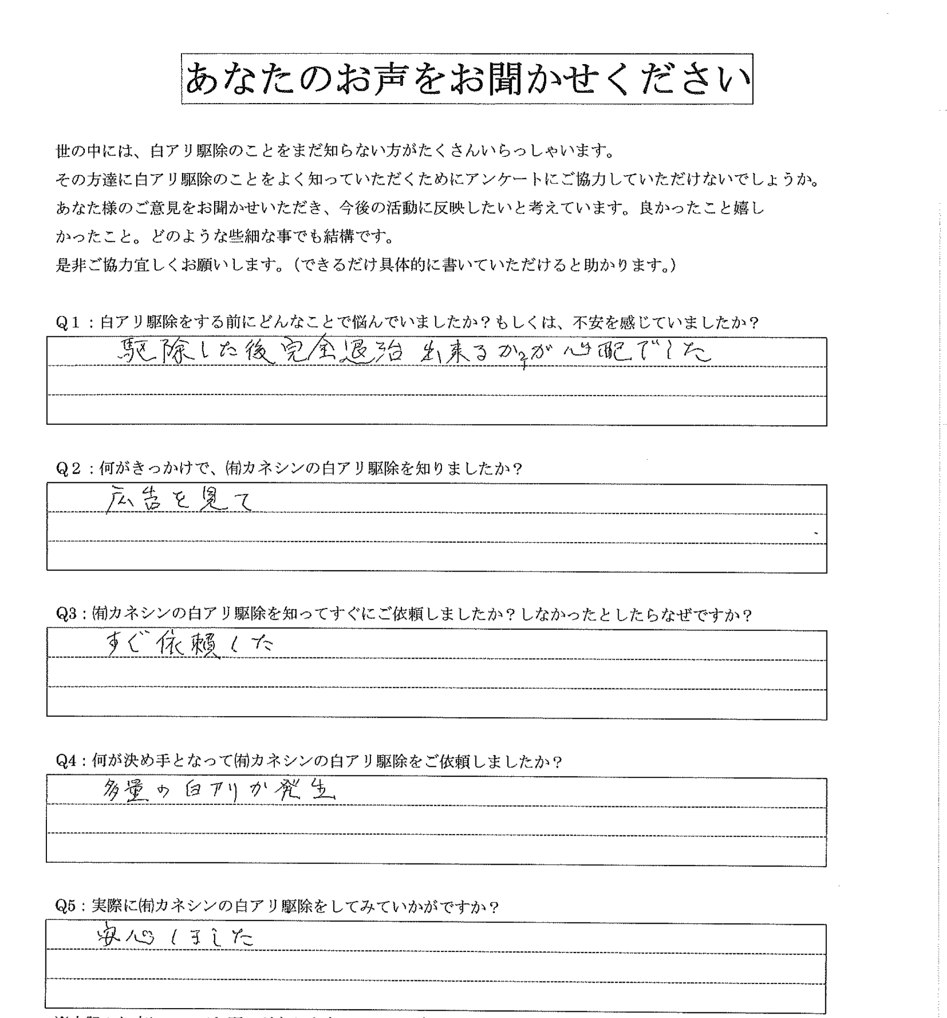 2022年04月12日(火) 新潟市 M様 シロアリ駆除 Q.1:白アリ駆除をする前にどんなことで悩んでいましたか?もしくは、不安を感じていましたか? 駆除した後、完全退治できるかが心配でした。 Q.2:何がきっかけで、カネシンの白アリ駆除を知りましたか? 広告を見て。 Q.3:カネシンの白アリ駆除を知ってすぐにご依頼しましたか?しなかったとしたらなぜですか? すぐ依頼した。 Q.4:何が決め手となってカネシンの白アリ駆除をご依頼しましたか? 多量の白アリが発生。 Q.5:実際にカネシンの白アリ駆除をしてみていかがですか? 安心しました。