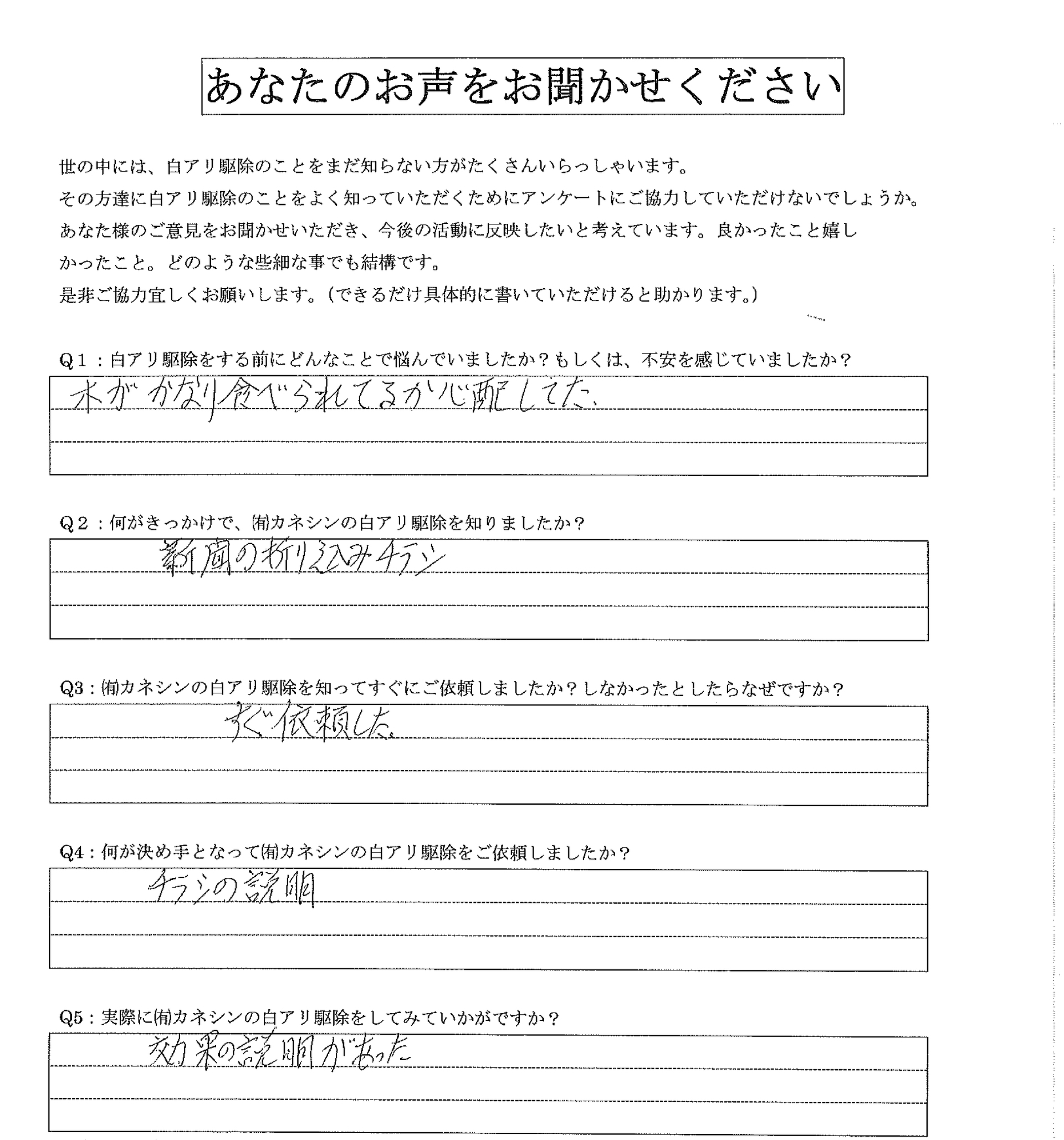 2022年04月12日(火) 新発田市 S様 シロアリ駆除 Q.1:白アリ駆除をする前にどんなことで悩んでいましたか?もしくは、不安を感じていましたか? 木がかなり食べられてるか心配していた。 Q.2:何がきっかけで、カネシンの白アリ駆除を知りましたか? 新聞の折り込みチラシ。 Q.3:カネシンの白アリ駆除を知ってすぐにご依頼しましたか?しなかったとしたらなぜですか? すぐ依頼した。 Q.4:何が決め手となってカネシンの白アリ駆除をご依頼しましたか? チラシの説明。 Q.5:実際にカネシンの白アリ駆除をしてみていかがですか? 効果の説明があった。