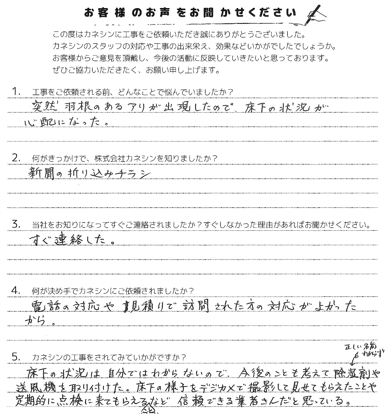 床下の様子をデジカメで撮影して見せてもらえたことや、定期的に点検に来てもらえることなど、信頼できる業者さんだと思っている。