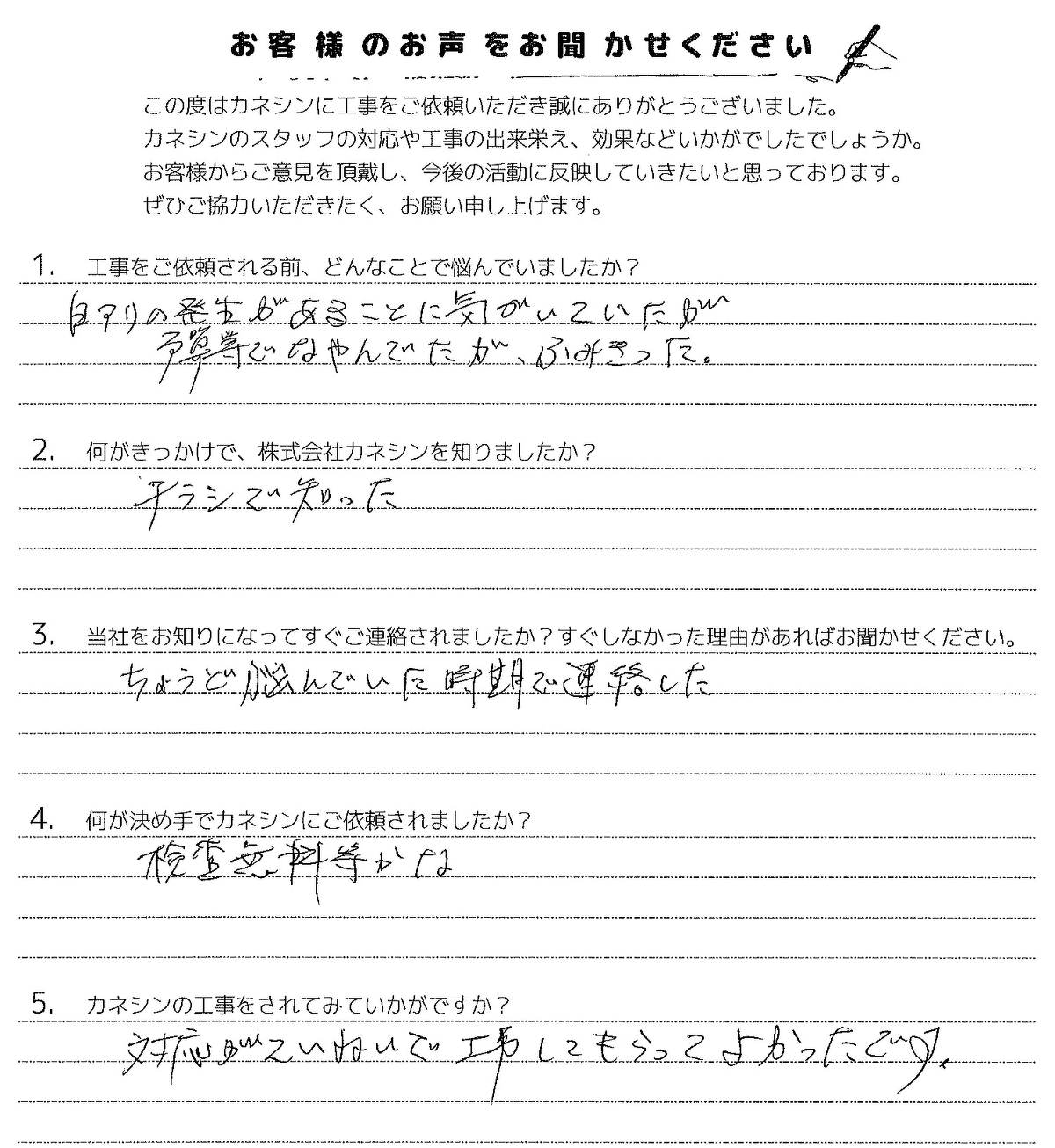 シロアリの発生があることに気がついていたが予算等でなやんでいたが、ふみきった。