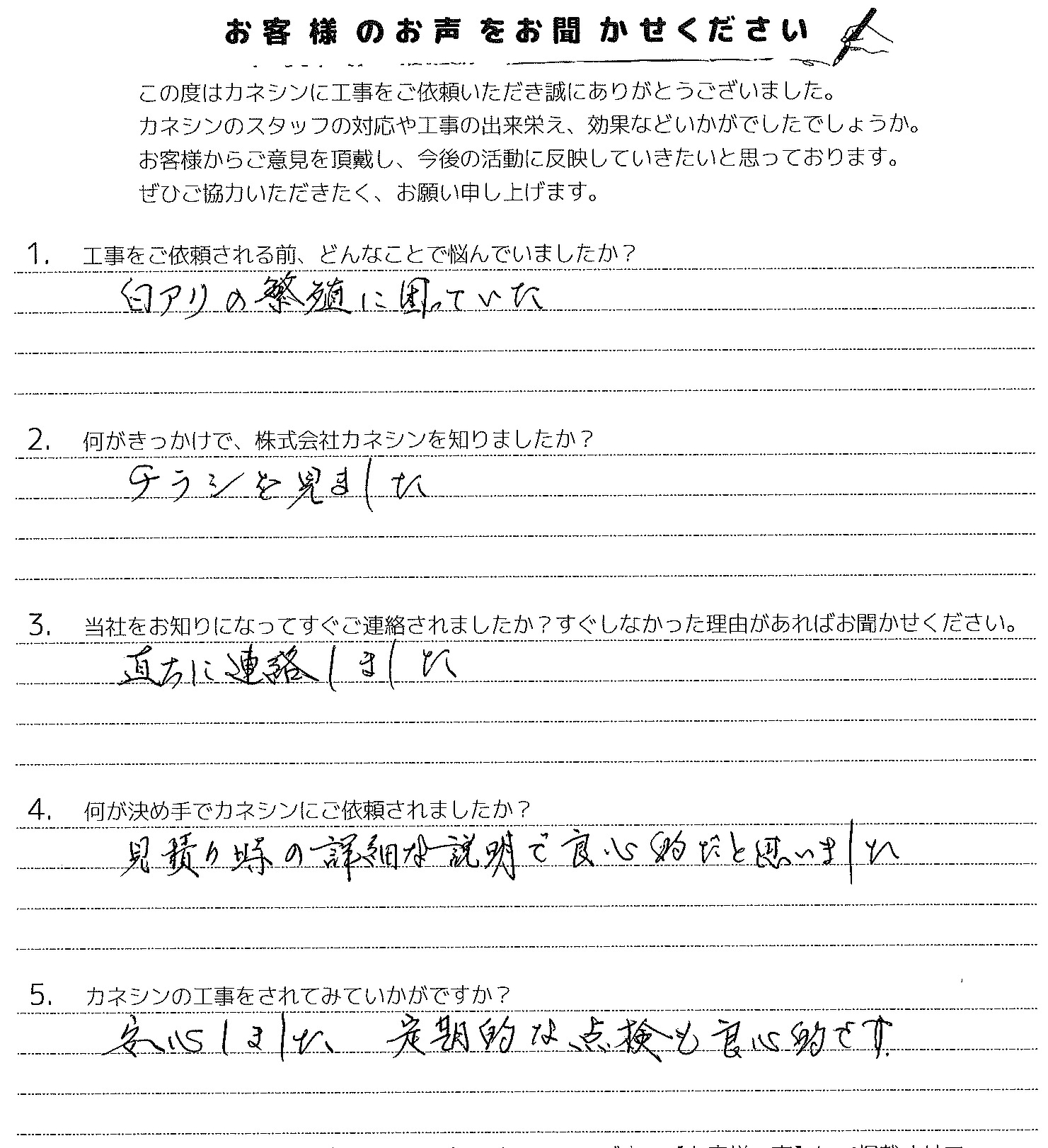 白蟻駆除の工事以外でも、基礎クラックの補修など様々なご依頼を頂き誠に有難うございました。
